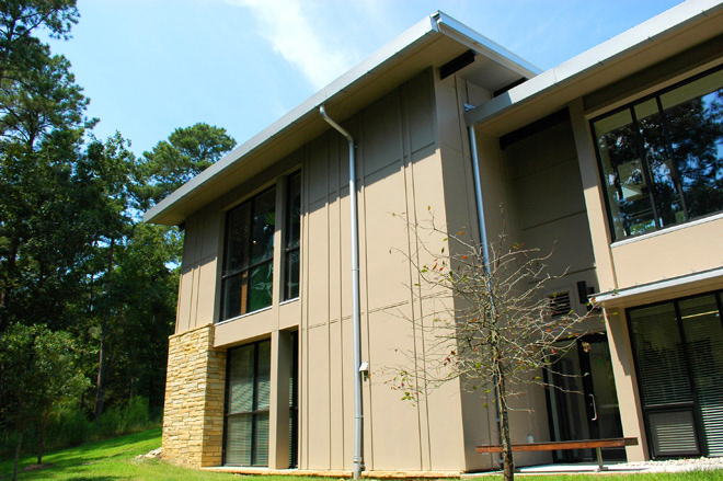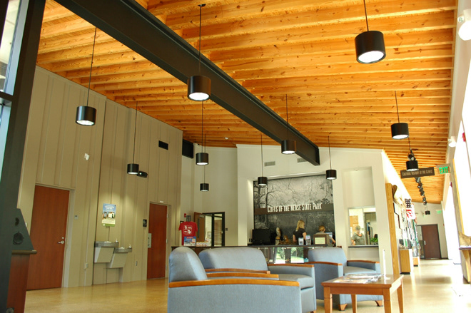 A Gold-level LEED-certified building, the Visitor Center and East District Office for the Cliffs of the Neuse State Park strives to minimize its disturbance of the landscape by building much of the lower level of the facility into the sloping terrain. By utilizing durable materials, the Center connects visitors to the park, providing views throughout the building - as well as a range of park and educational information in the lobby and exhibit hall. LOCATION: Seven Springs, NC. SIZE: 9,116 s.f. COST: $3,799,260-Project budget. CLIENT: NCDENR - Division of Parks and Recreation. DESCRIPTION OF SERVICES: Full architectural design services (conceptual design to construction administration) including LEED administration, re-configuration/improvements to road access to building, new septic system, utility extensions, acquisition of NCDENR and Wayne County permits, and coordination of Exhibit Design for the project.
