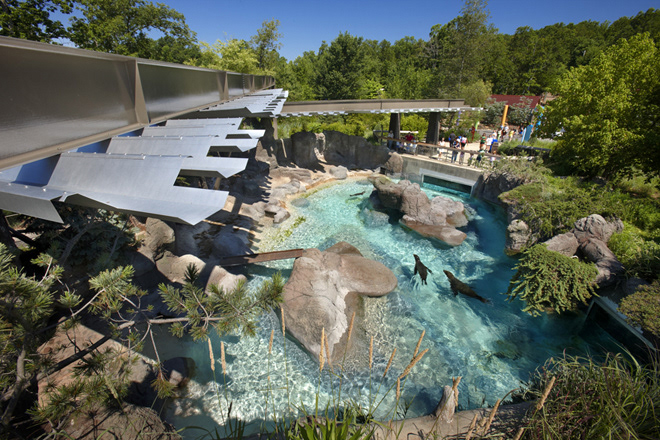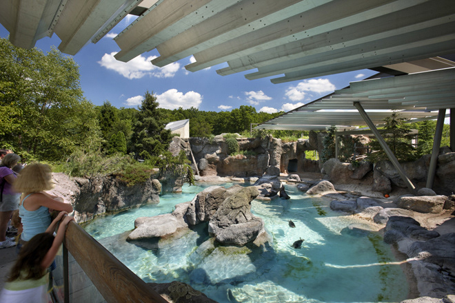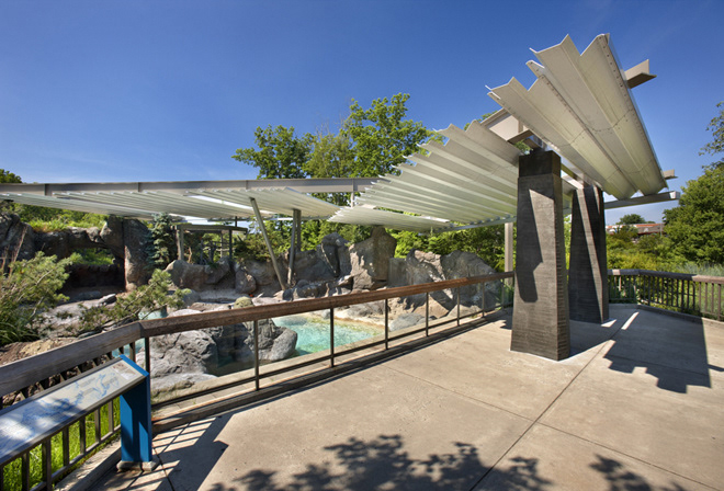 The seal and sea lion habitat at the NC Zoo in Asheboro NC required a shade canopy to protect the health of the animals and enhance the comfort of visitors on the viewing platform. A steel structure spanning the exhibit supports pre-formed galvalume shade panels above the water edge, rockwork beaches, and visitor viewing platform. LOCATION: Asheboro, NC. SIZE: 2,358 s.f. COST: $646,900. COMPLETION: 2008. CLIENT: NCDENR - NC Zoo. ARCHITECT-OF-RECORD: A company purchased by Mayowa Alabi. DESCRIPTION OF SERVICES: Full architectural design services (conceptual design to construction administration) on new exhibit shade structure and removal of existing cable supported structure. Services provided included assessment of existing pool coating, repair of artificial rock leaks, surface preparation and installation of new “themed” coating.